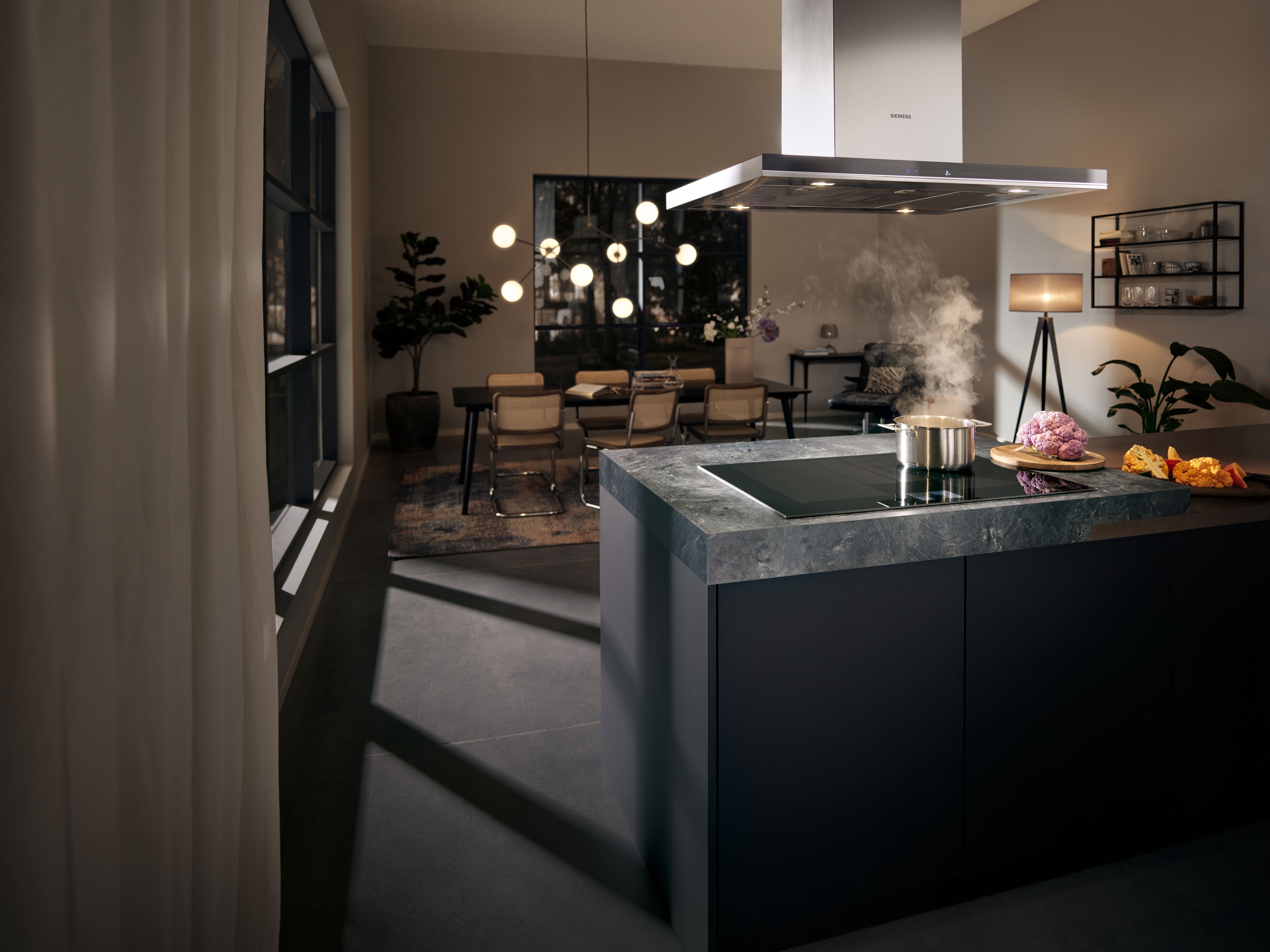 Hvordan skulle dit køkken se ud, hvis du ikke behøvede at tage højde for en emhætte? Siemens inductionAir Plus forener det bedste fra to verdener: En overlegen flexInduction kogeplade og et kraftfuldt emfang. En kombination, som giver dig endnu flere valgmuligheder for at skabe et køkken, der passer til din drøm. Hvorfor ikke placere kogepladen foran et vindue? Under et skråt loft? Eller i en kogeø? Design dit personlige køkken uden begrænsninger.