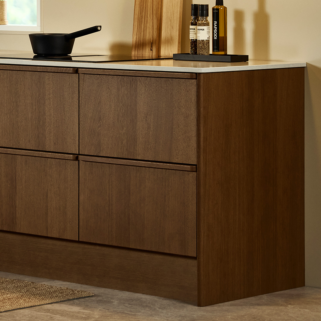 De runde hjørner afslutter hver front men skaber med flere fronter på en række en fin harmoni og et sammenhængende udtryk. De runder hjørner går igen på bordpladen og endegavle.