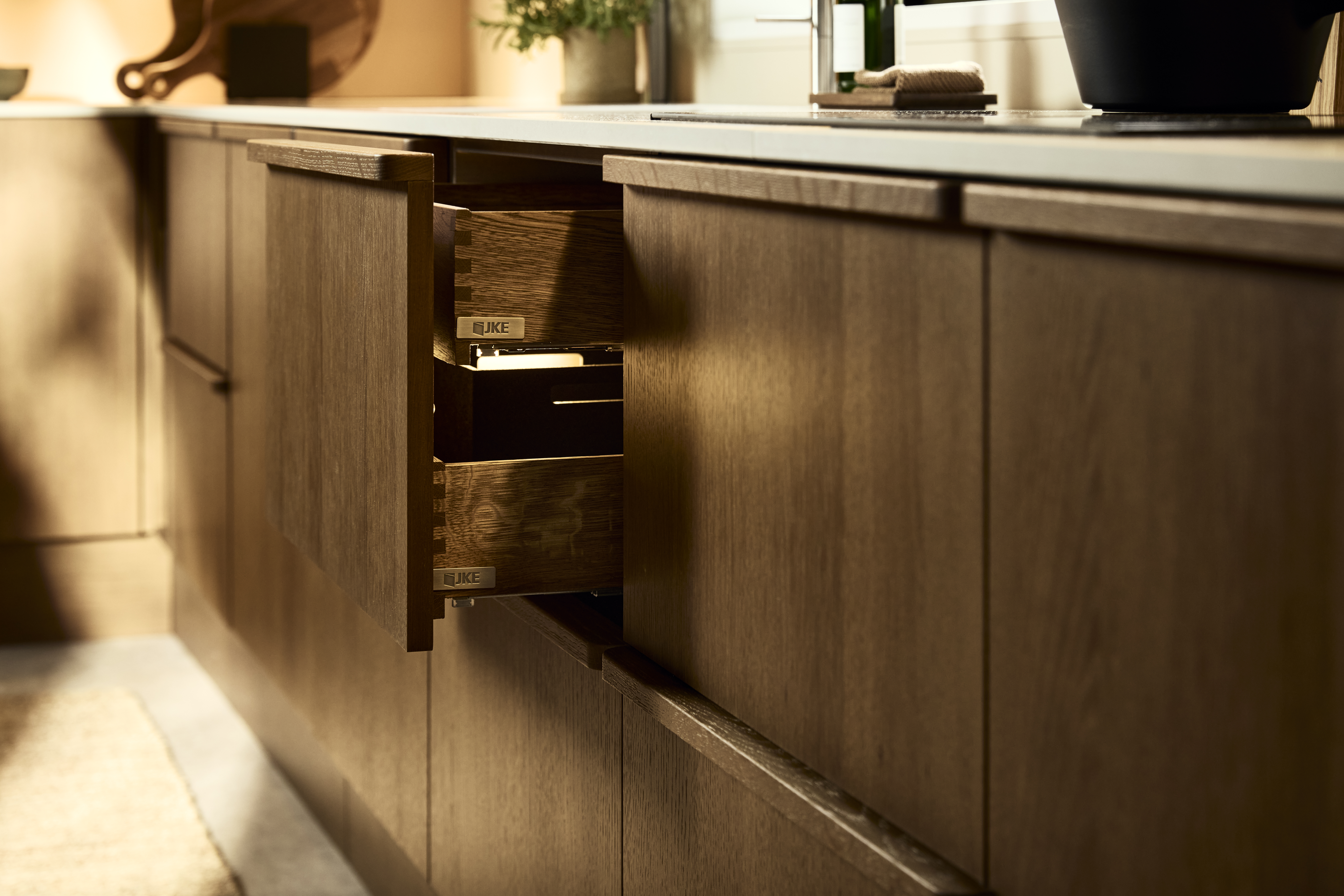 Nordic Studio er opbygget 19 mm plade med afrundet kant og massiv greb med udfræsning i hele frontens længde.