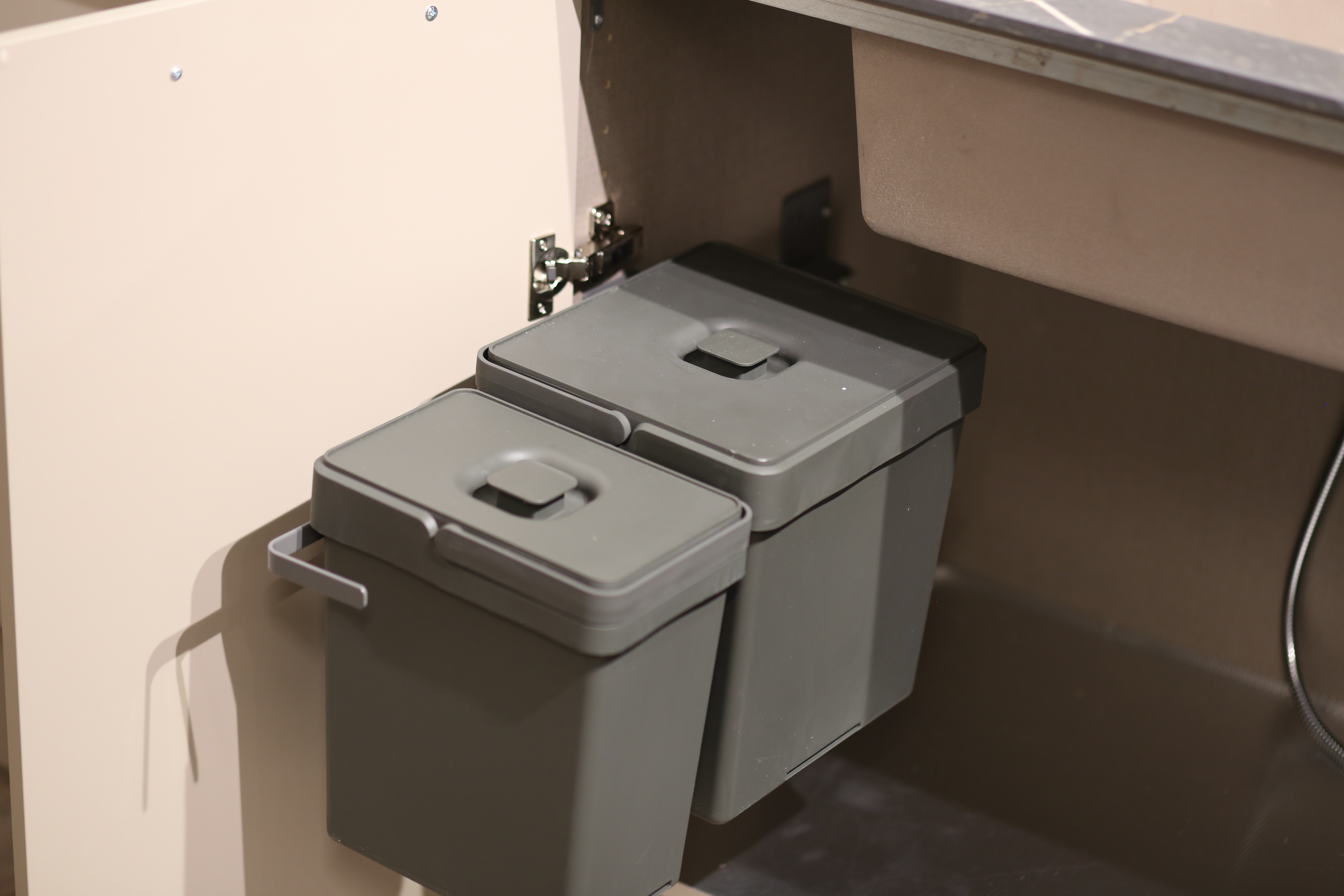 Funktionelt og praktisk affaldssystem med grålakeret ramme. Fås i to varianter til montering i bund af henholdsvis Hvid og Craft skuffe og en variant til montering i Zentith skuffe.