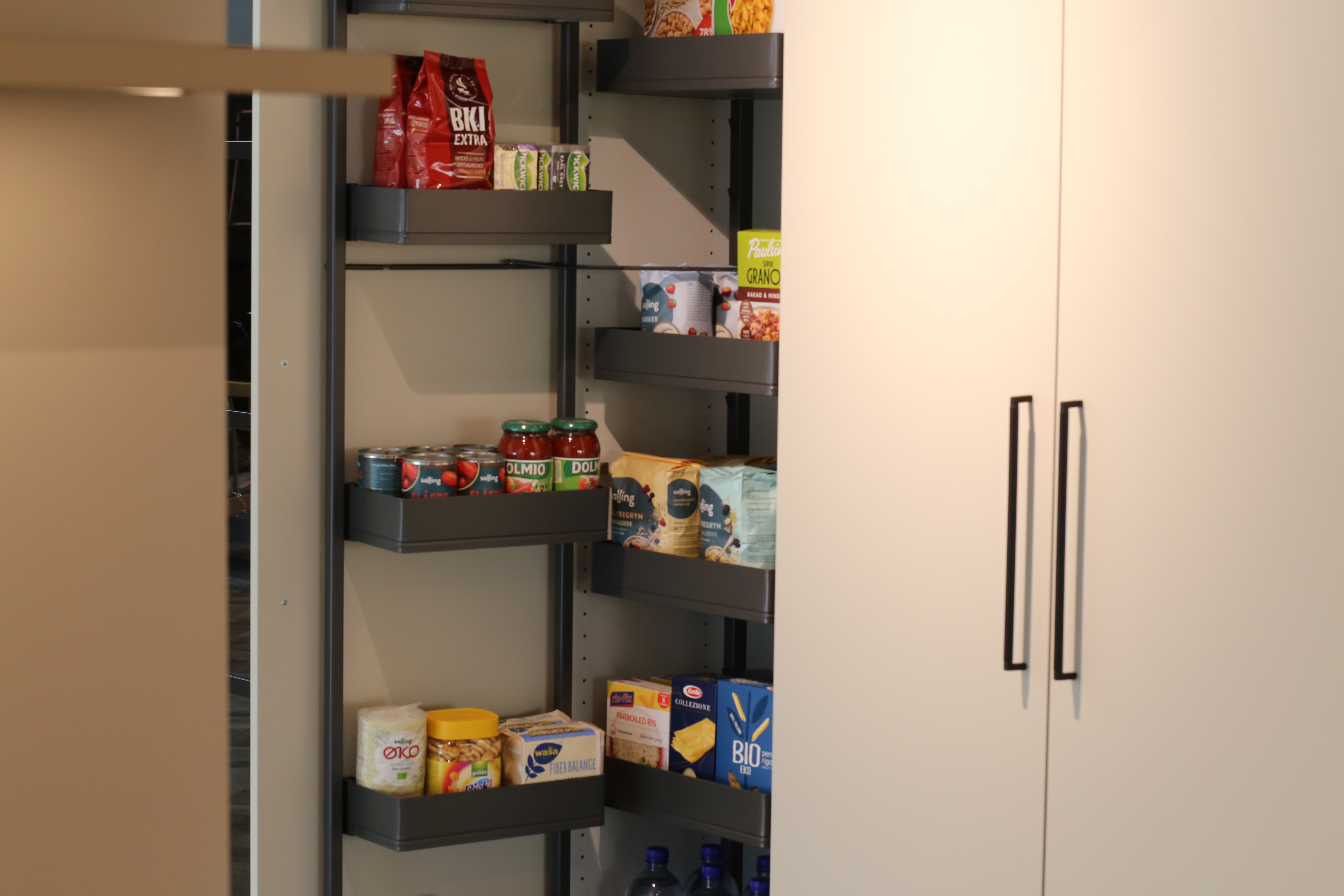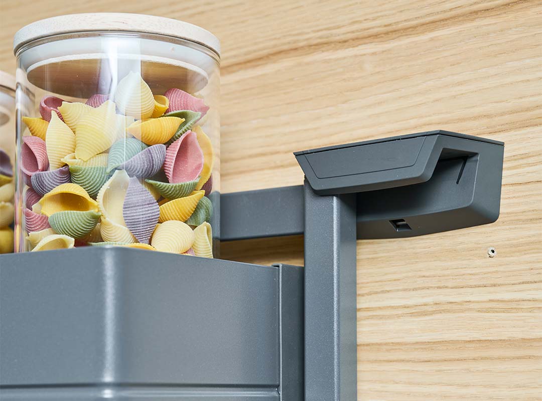 Kolonialskabet giver masser af dejlig opbevaringsplads lige i øjenhøjde. Tandem udtrækket giver opbevaring i to lag, og dermed bedre overblik over eksempelvis kolonialvarer. Skabet monteres med et front udtræk, der følger med lågen ud, når der åbnes. Den ene del af opbevaringspladsen er på skabslågen og den anden del følger med ud, når du åbner skabet.