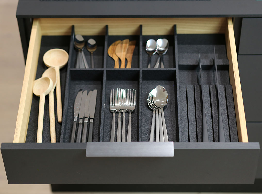 Bestikindsatsene er mat sorte og fås både til træskuffer og de grå Zenit stålskuffer.