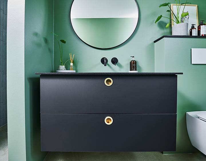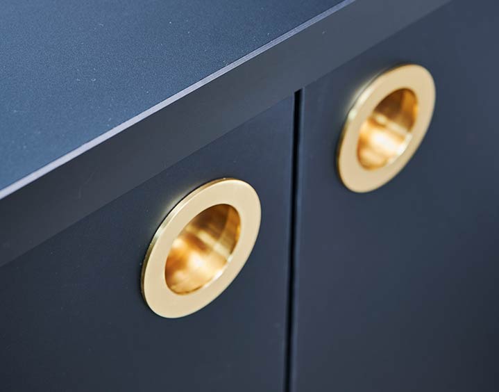 Egetræ kombineret med mørke, silkebløde overflader på skuffer er gennemgående materialer. Det samme er messing på vandhaner og greb. En fin detalje er de runde messinggreb, som leder tankerne hen på 70’erne, hvor de runde greb var i stort set alle køkkener. Messinggrebet har parret selv fundet og fået monteret på alle de sorte silk overflader.