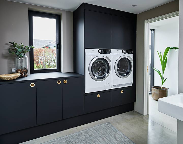 Funktionalitet og lækre detaljer går hånd i hånd i det store køkken. Andrew holder meget af at lave god mad, og det røber sig i indretningen. Eksempelvis har familien valgt en vask på 80 centimeter i stedet for 60 centimeter, så der er god plads til fx bradepander, når de skal vaskes. ”Når jeg laver mad, så skal der være god plads – også til at rode lidt,” siger Andrew, mens Lena forsikrer, at hun er god til at rydde op.