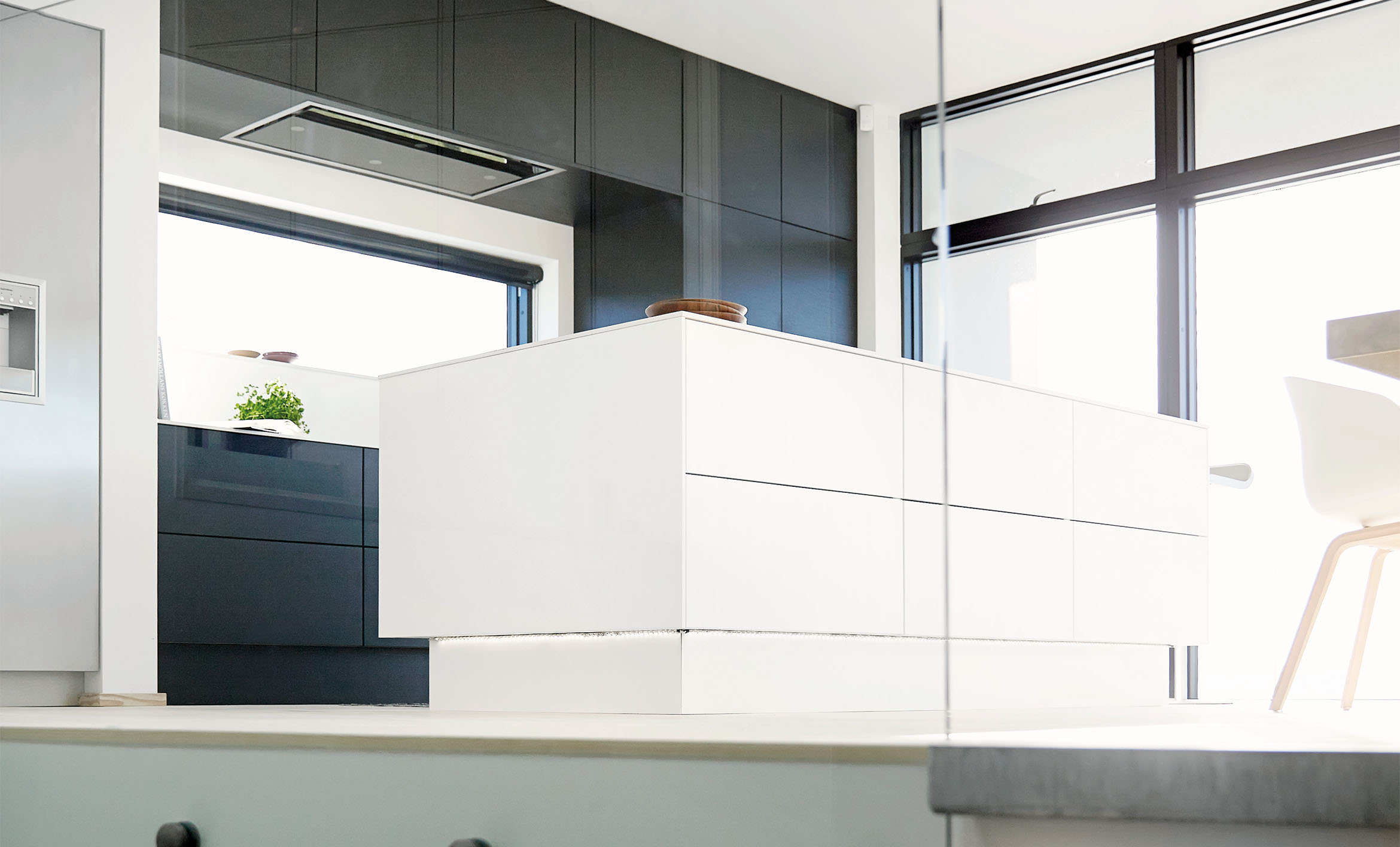 Køkkendesignet tager afsæt i JKEs Nordic One køkkenmodel, der med sine rene linjer matcher de industrielle omgivelser. Køkkenøen er hvid, så den virker let og luftig foran de store panoramavinduer. Køkkennichen er i elegant og stilren sort eg, der med sine diskrete åretegninger giver rummet varme og spiller op mod væggens rå beton.