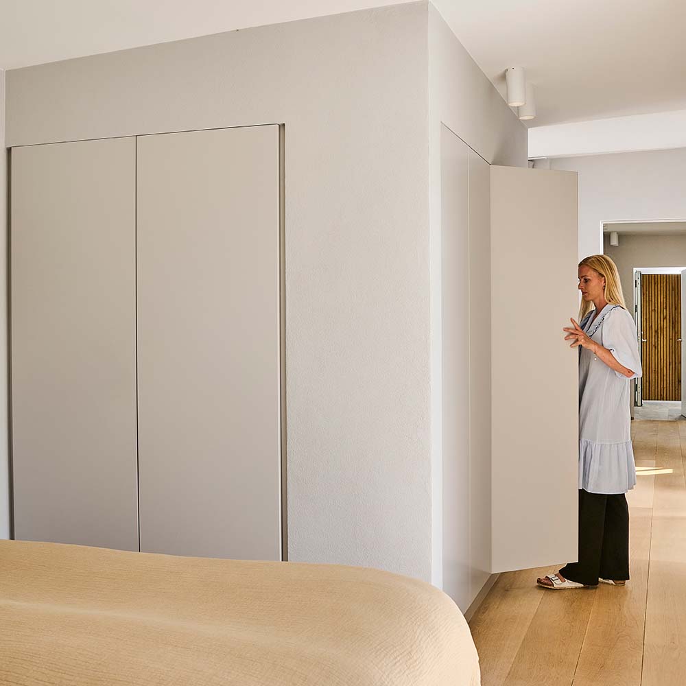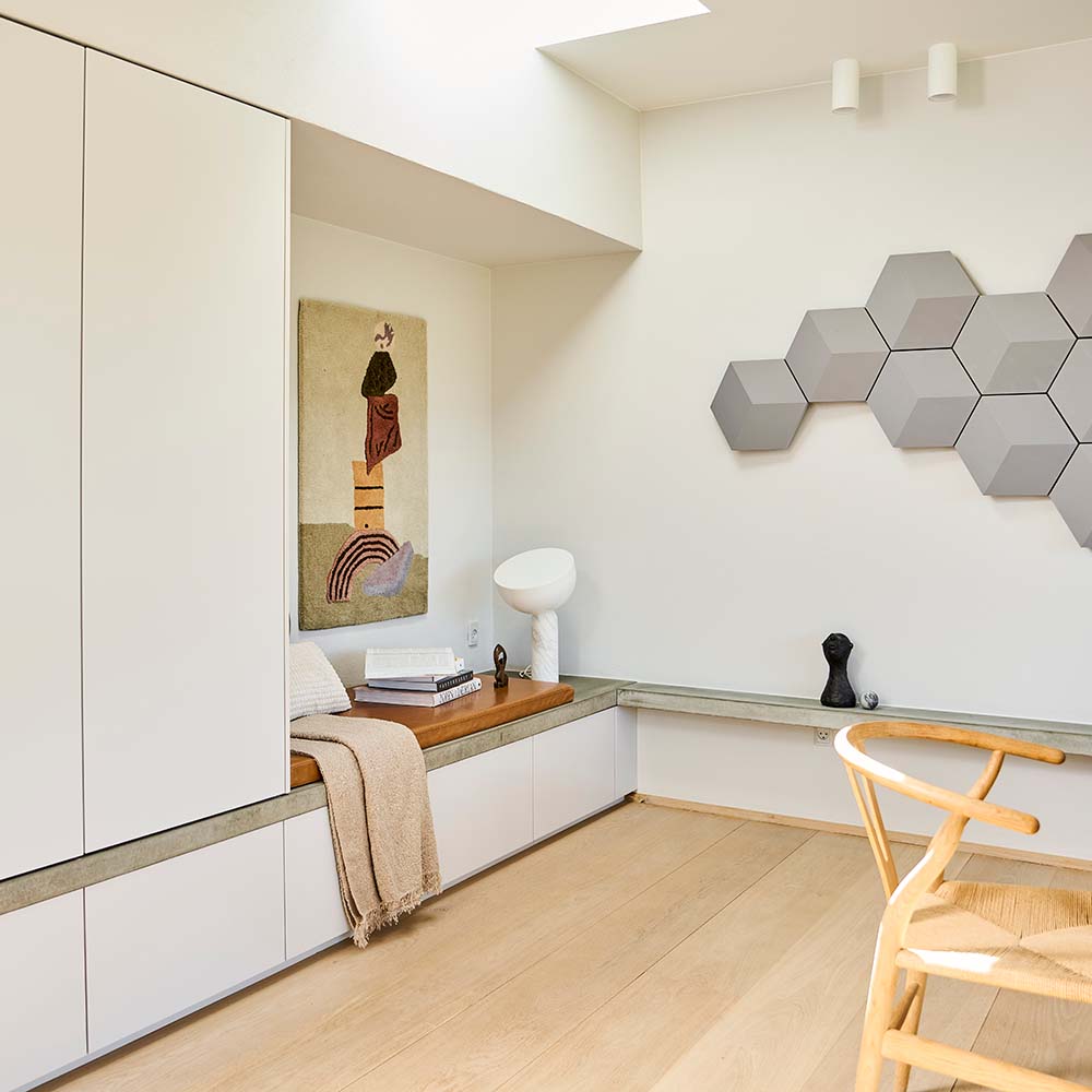 Den lysegrå varme farve giver ro i rummet, og specielt når samme nuance går igen på væggene. Alle vægge og skabe har fået samme grå farve, hvilket er med til at give en helhed i hele huset.