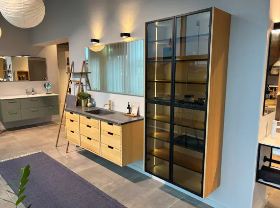 - Høskab m. vitrine, indfræst LED lys og finerede hylder.