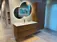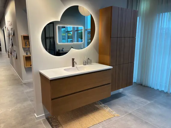 Lækkert badeværelses miljø i varm eg. Modeller: Nordic Inline og woodlands, med bordplade m istøbt vask i lys beton