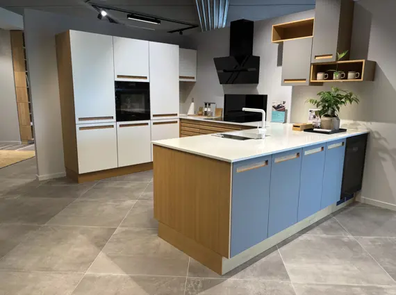 - Lågetype: Nordic Modern – hvid + grå laminat/natur eg + massive multifronter