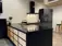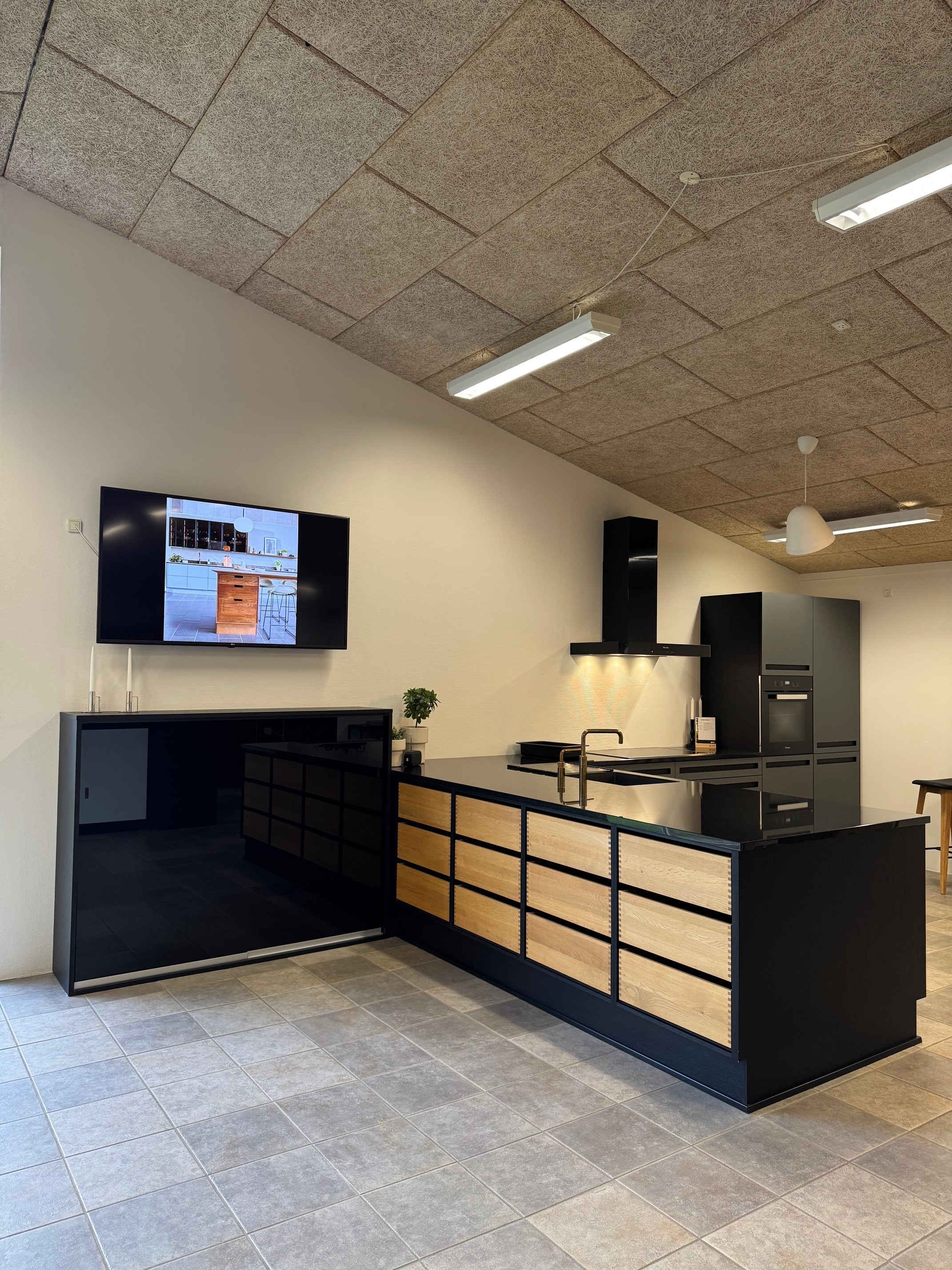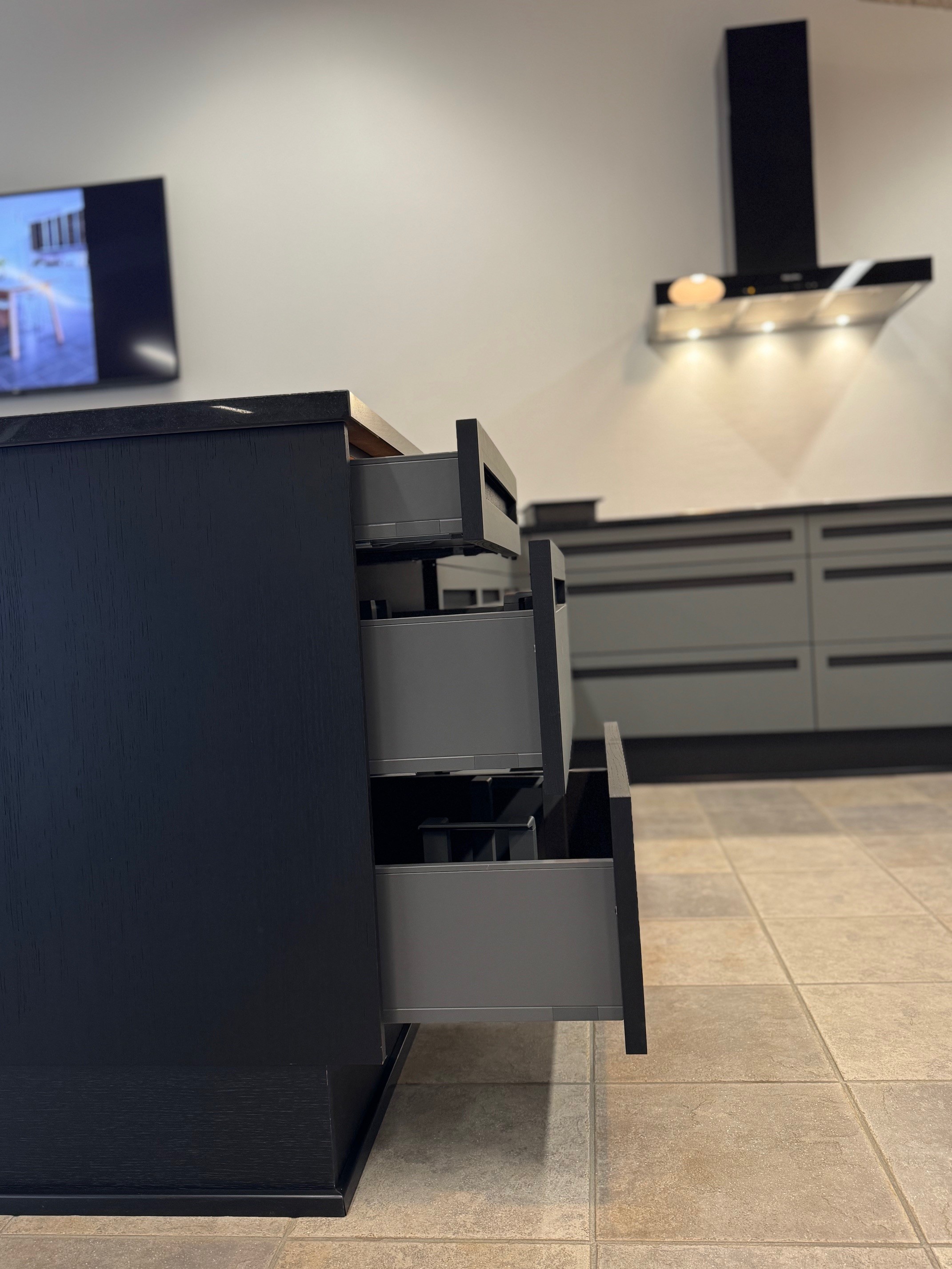 Flot køkken med linoleums fronter, Craft skuffer og naturstensbordplade.
