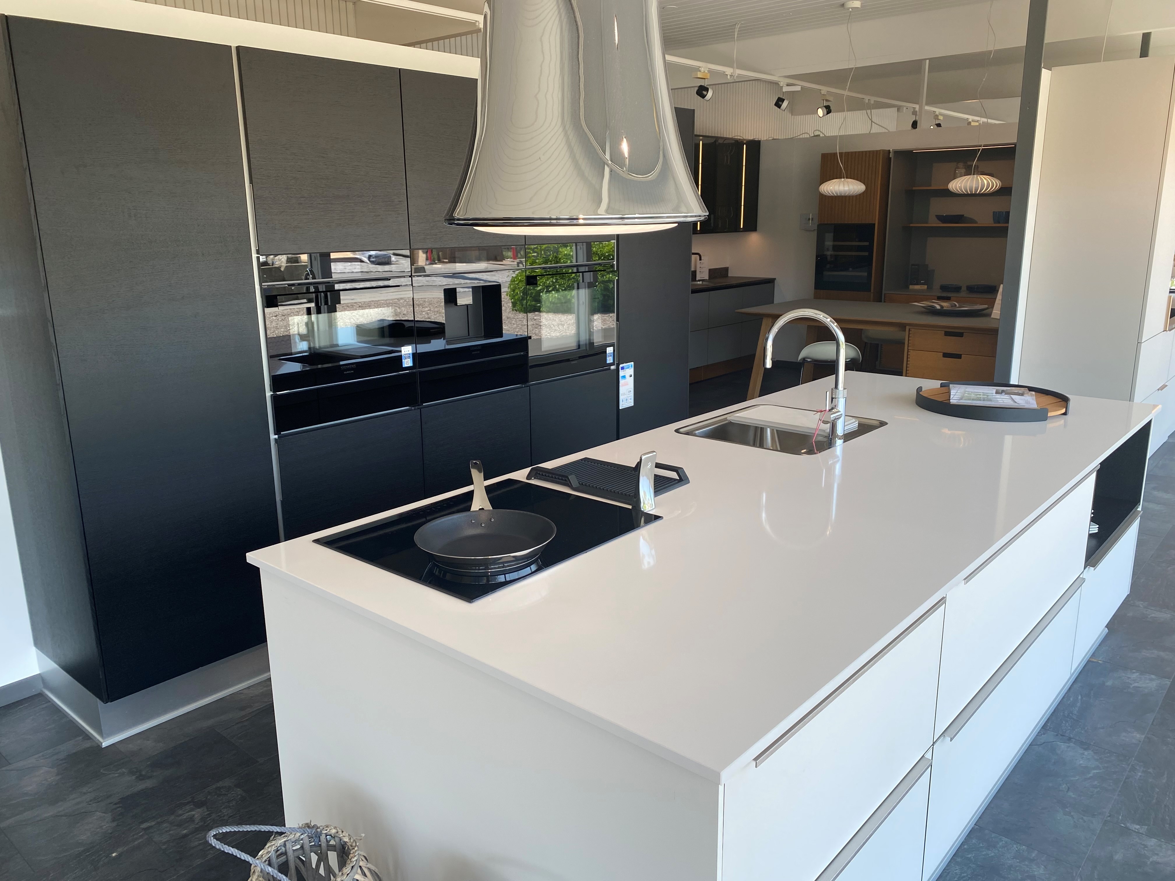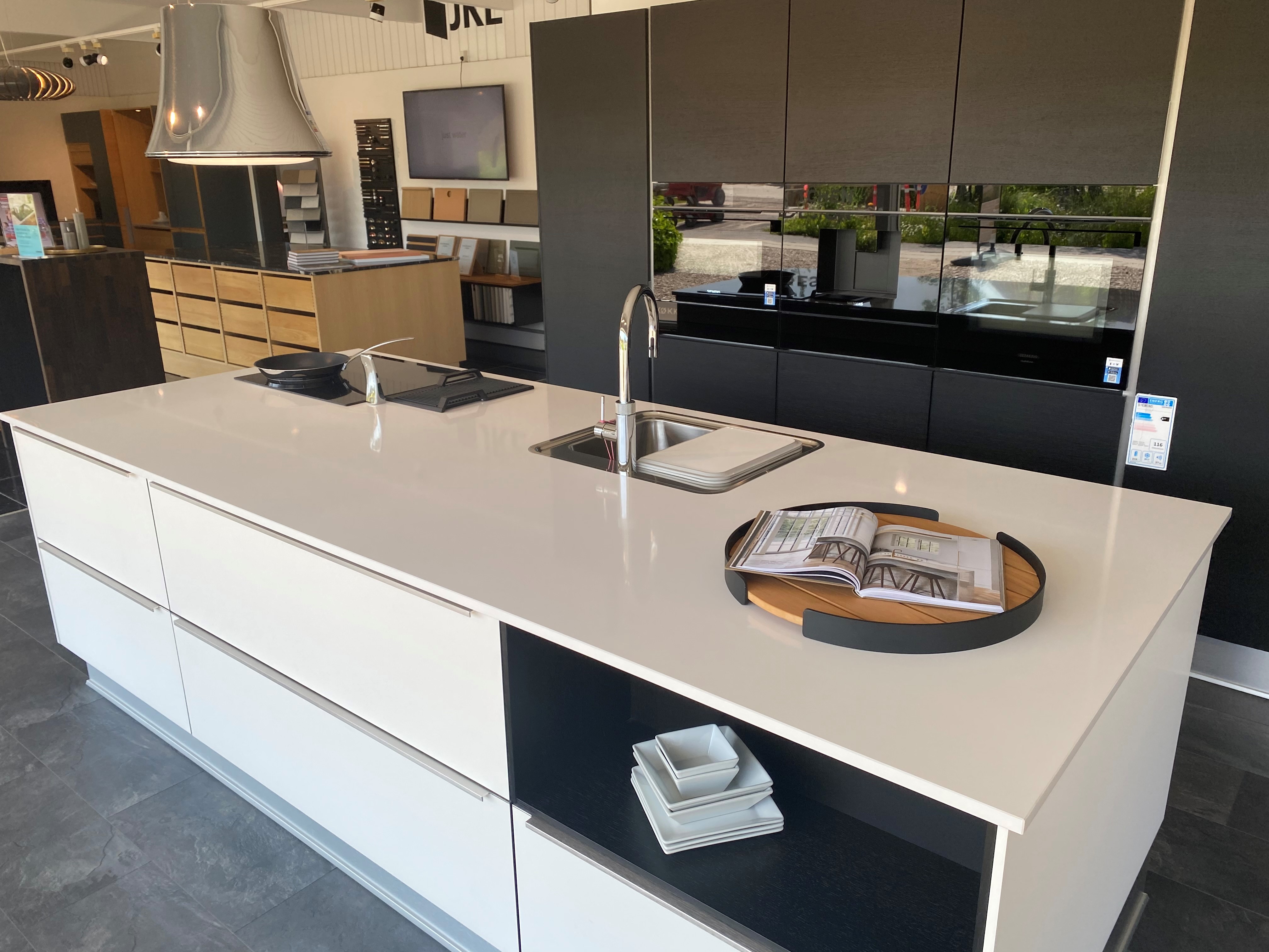 Nordic One line exclusiv. Komposit bordplade 20 mm Blanco Zeus poleret. White skuffer. Elegant køkken med højskabsvæg og køkkenø med koge og vaskeplads.