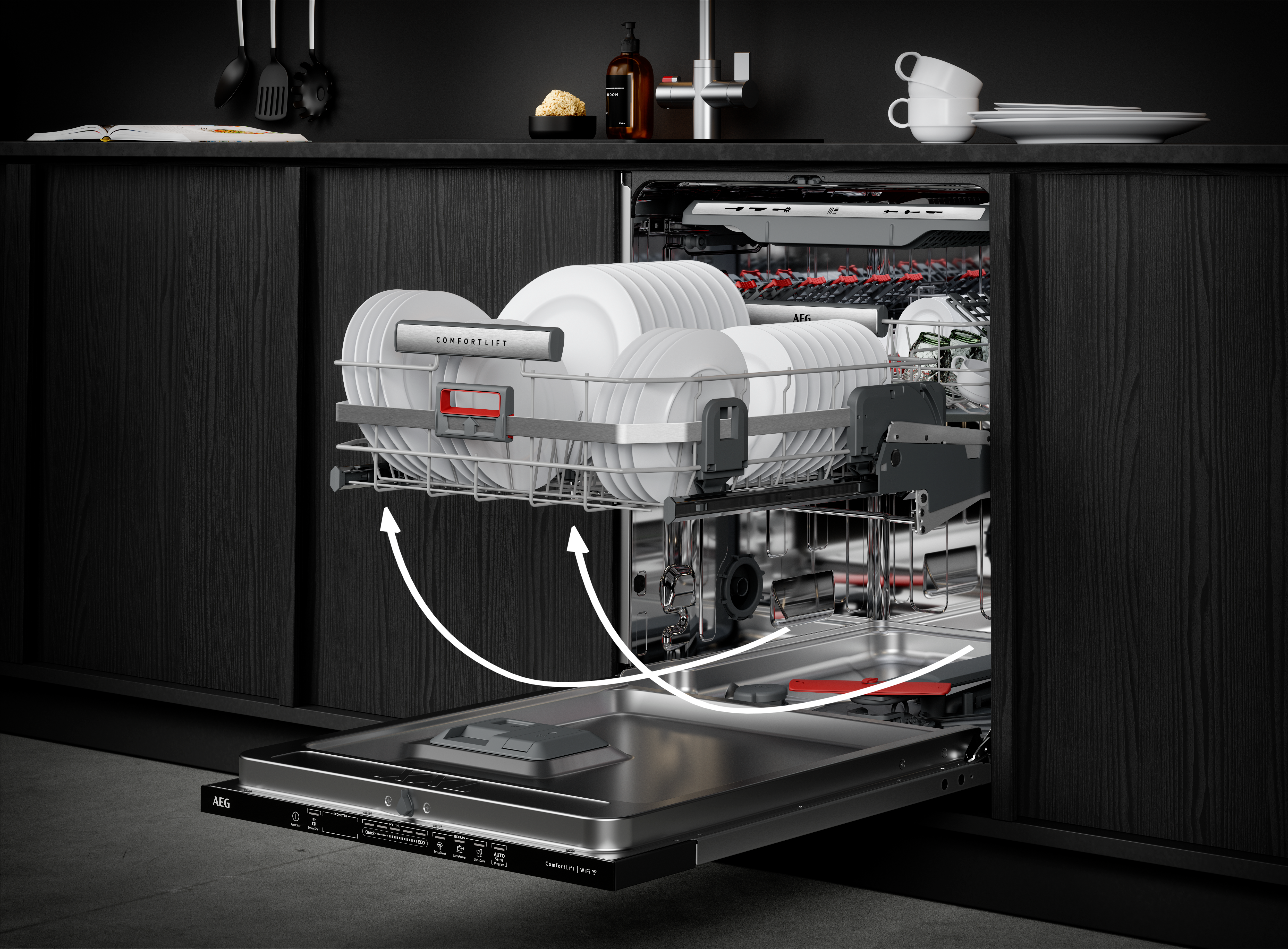 ComfortLift® – Verdens første løft-og-last oppvaskkurv. ComfortLift® revolusjonerer oppvasken med en smart og ergonomisk løsning: verdens første hevefunksjon for den nedre kurven. Med et enkelt løft bringes kurven opp i en behagelig arbeidshøyde – for enklere og mer komfortabel inn- og utlasting