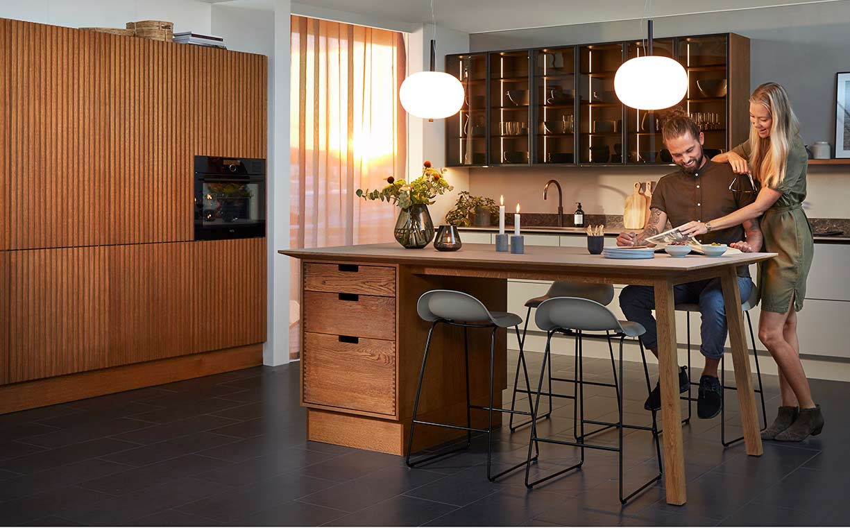 Mulighetene er utallige. Liker du et klassisk snekkerkjøkken i eiketre? Skal frontene være i den spesielle nyansen av blå som du elsker? Ikke noe problem – vi hjelper deg i mål med drømmen om et unikt og personlig kjøkken. Se noen av tilpasningsmulighetene dine nedenfor.