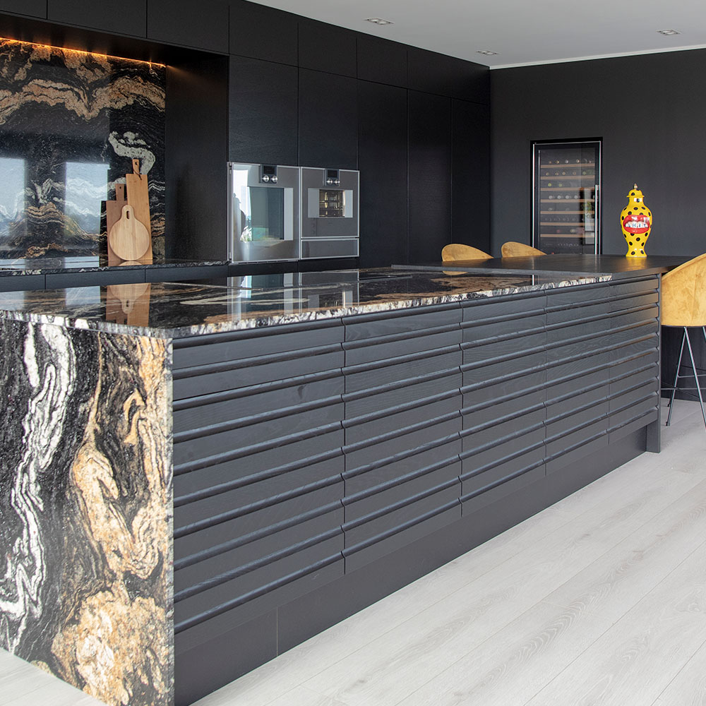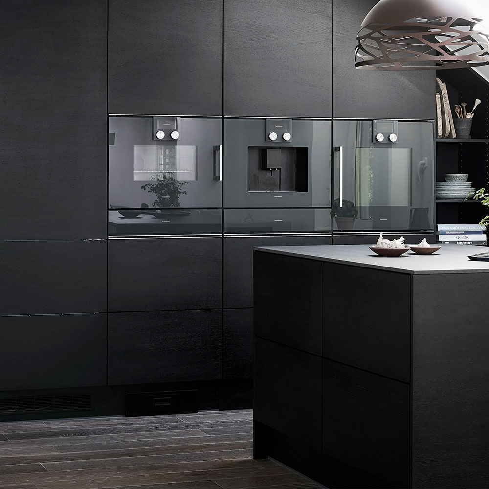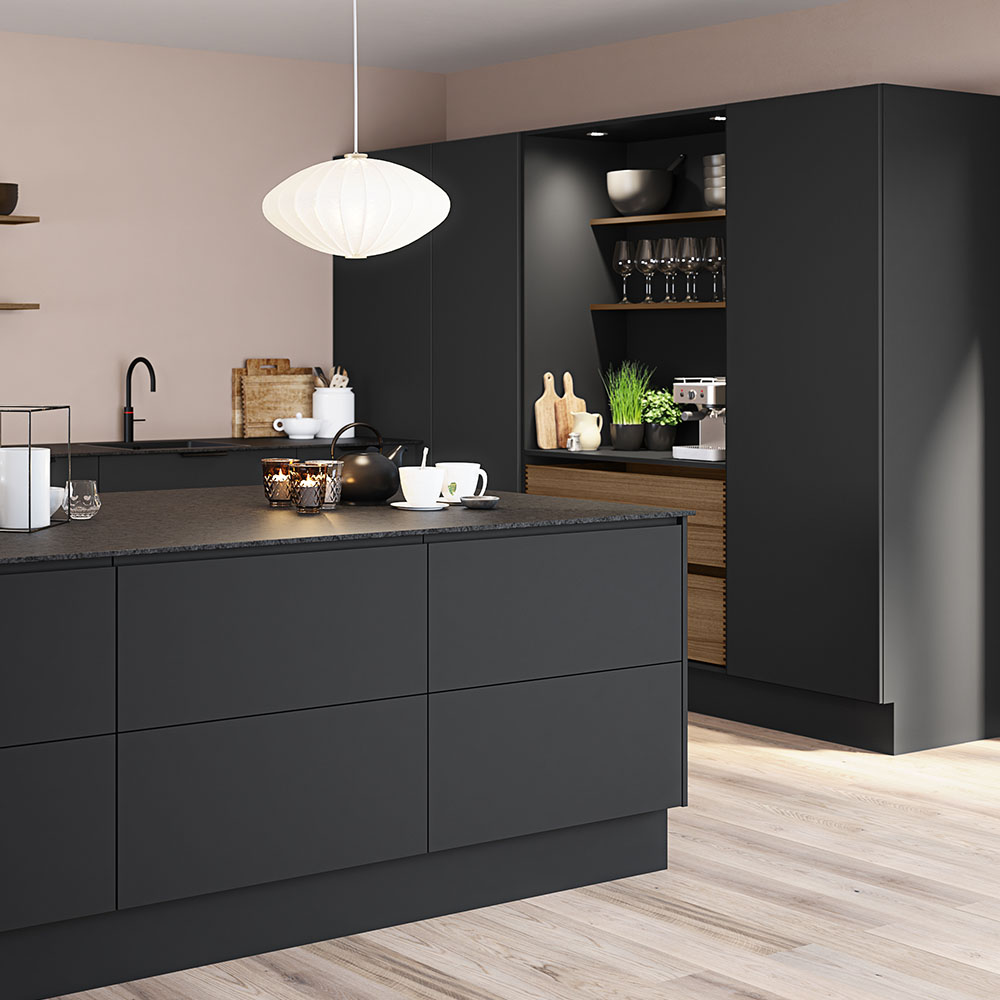Når sort ikke bare er sort. En del av det sorte kjøkkenets eksklusive appell ligger i at sort kan fremheve detaljer. Ta for eksempel kjøkkendesignen Nordic Woodlands i sort eik. Her minner de enkle frontene med vertikale linjer og den sorte fargen om trestammer ute i skogen. Detaljene i treets struktur blir tydeligere og fremhever det elegante designet.