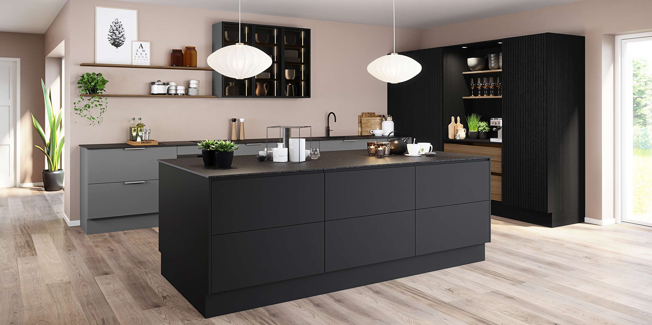 For å gi kjøkkenet mer personlighet og en mer eksklusiv look, har vi oppgradert høyskapene i lamelldesign for modellen Nordic Nature til sort eik. Nordic Nature matcher perfekt til de massive treskuffene i baristaskapet, trekker naturen inn på kjøkkenet og gir god akustikk.