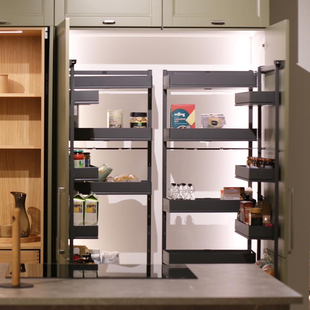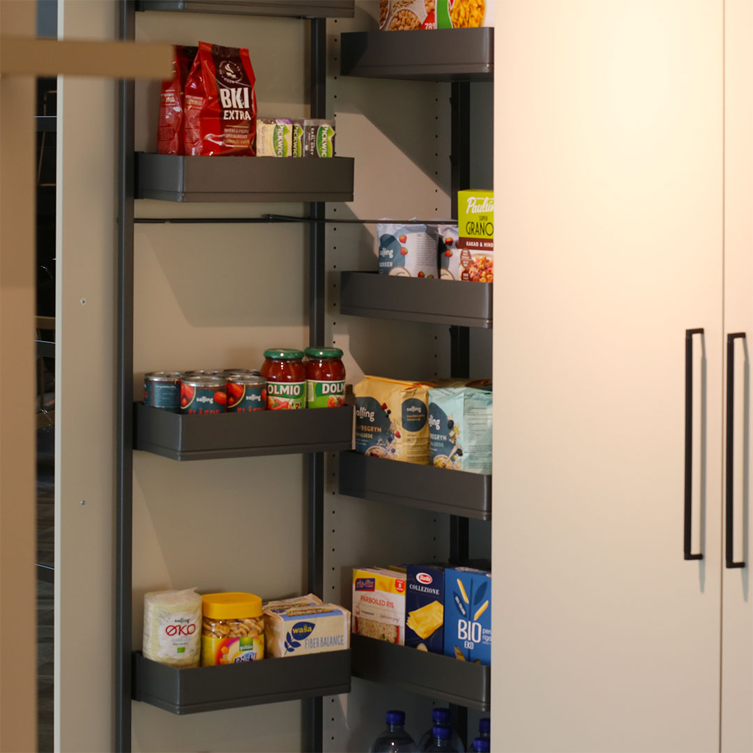 Matskapet gir masse praktisk oppbevaringsplass i øyehøyde. Tandemuttrekket gir oppbevaring i to lag, og dermed bedre oversikt over for eksempel matvarer. Skapet monteres med et frontuttrekk som følger med døren ut når det åpnes. Den ene delen av oppbevaringsplassen er på skapfronten, og den andre delen følger med ut når du åpner skapet.