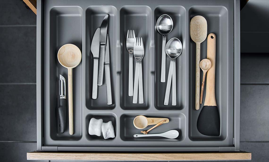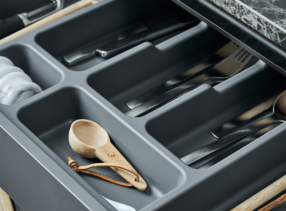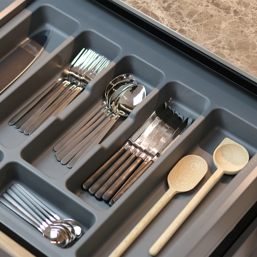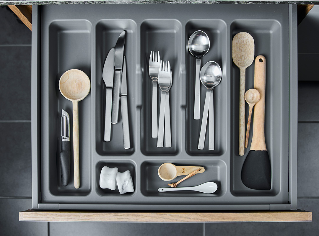Skuffeinnsatser i hardplast passer perfekt i skuffen, med forhåndsinndelte rom som gir deg en god skuffeinnredning. Den vanligste skuffeinnsatsen er bestikkskuffen, som finnes til alle skuffebreddene våre. I tillegg kan du få innsatser med stort rom.