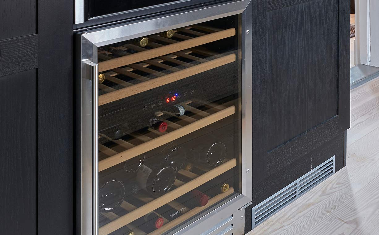Han valgte et stilrent, moderne, klassisk kjøkken. Ga det et mørkt og hyggelig uttrykk med den klassiske kjøkkenmodellen Frame i sort eik sammen med en keramikkbenkeplate i samme sorte nyanse. Han gjennomførte det moderne og stilrene uttrykket med brede skuffer uten håndtak i hele kjøkkenet og skapte dermed et varmt og hyggelig rom.
