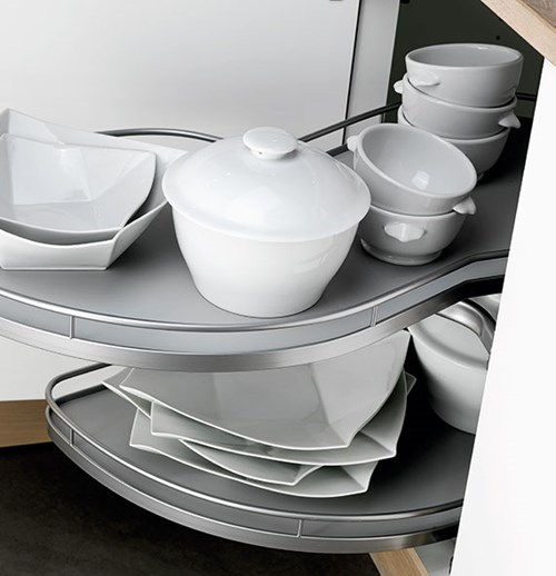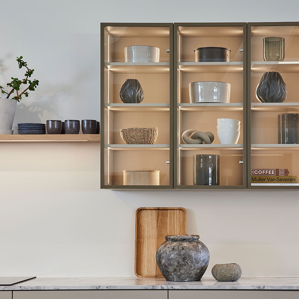 Vi har tänkt nytt kring vitrinskåpet och kombinerat strikt, industriell design med värme och trivsel i form av rökfärgat glas, trähyllor och mjuk belysning. Det kan kombineras med alla modeller och ge köket liv och personlighet.