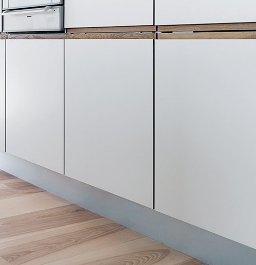 Att förnya den minimalistiska, handtagsfria luckan kan verka omöjligt. Vi på JKE lyckades med detta – resultatet är Nordic Modern. En lucka med träkanter och infrästa handtag i massivt trä.