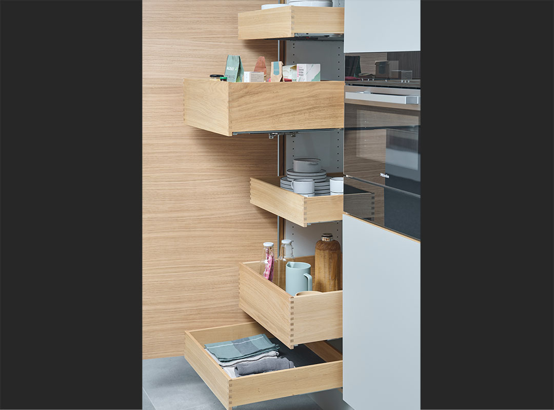 Du kan välja att få högskåpet med olika typer av backar – de mattgrå Zenit-backarna med utdragshyllor med fast botten eller den exklusiva versionen med sinkfogade backar i ekträ.