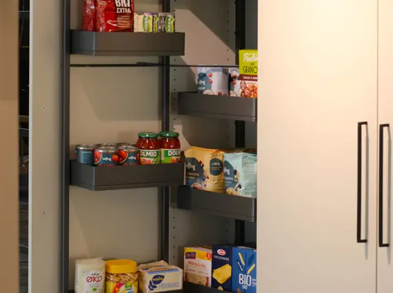 Skafferiskåpet ger massor av snyggt förvaringsutrymme precis i ögonhöjd. Tandem-utdraget erbjuder förvaring i två lager och därmed bättre överblick över exempelvis torrvaror. Skåpet monteras med ett frontutdrag som följer med luckan ut vid öppning. Den ena delen av förvaringsutrymmet finns på skåpsdörren och den andra delen följer med ut när man öppnar skåpet.