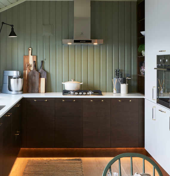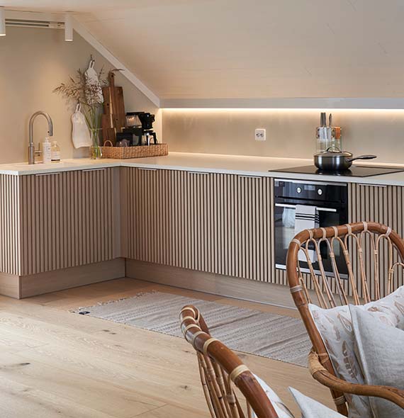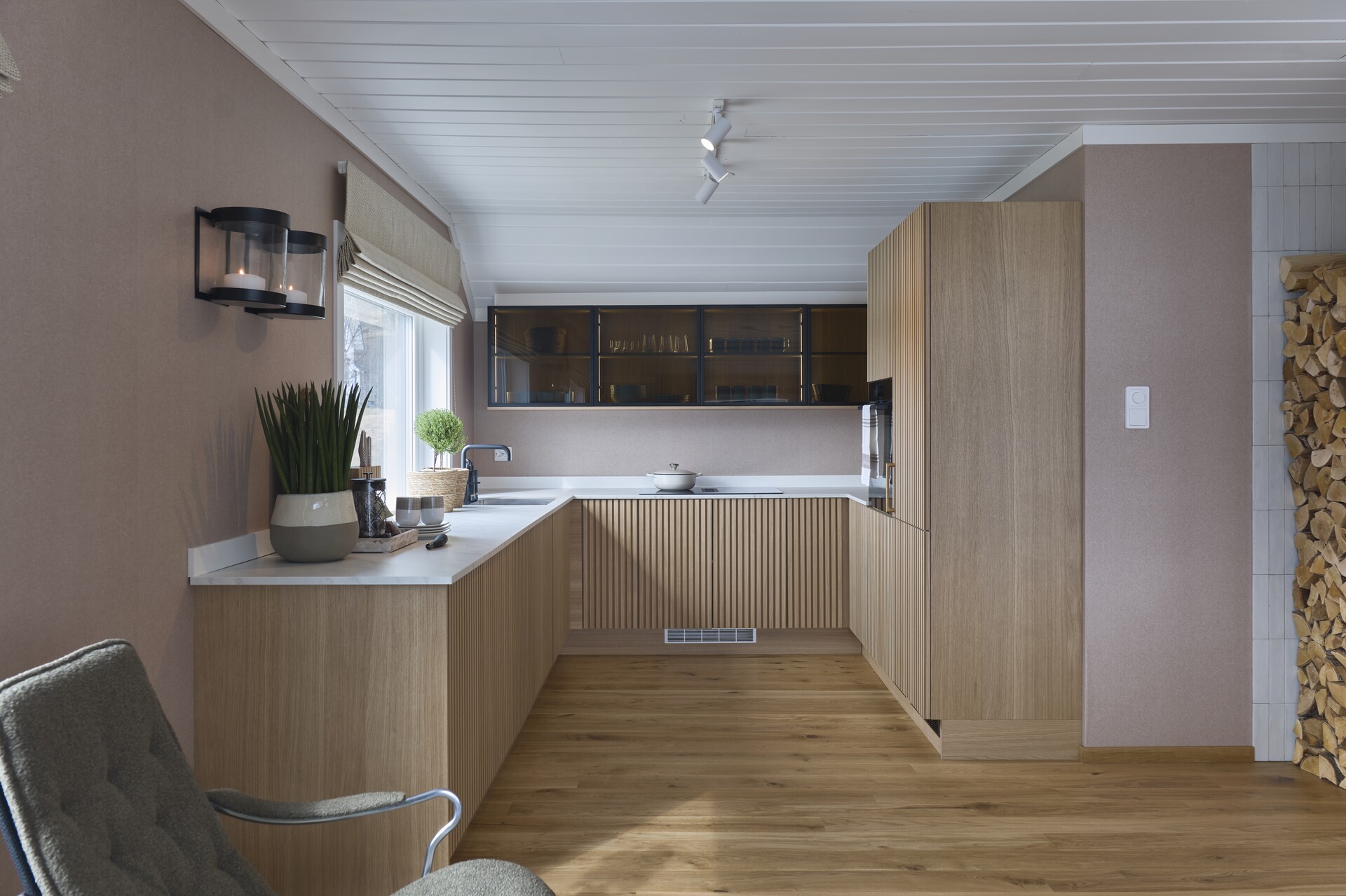 I säsongens första avsnitt går turen till vackra Orre på Jæren utanför Stavanger med utsikt över vackra Orrestranda. Halvor och teamet utgår därför just från den vackra naturen som omger stugan. De förvandlar den nämligen till ett ljust och skandinaviskt paradis, där naturen i hög grad får följa med in. Vårt högskåp i Nordic Nature-ek, vårt underskåp i vitt Inline-laminat med ekdetaljer och våra öppna hyllor i ekfaner passar perfekt in i detta nya vackra semesterparadis.