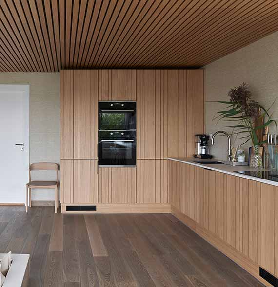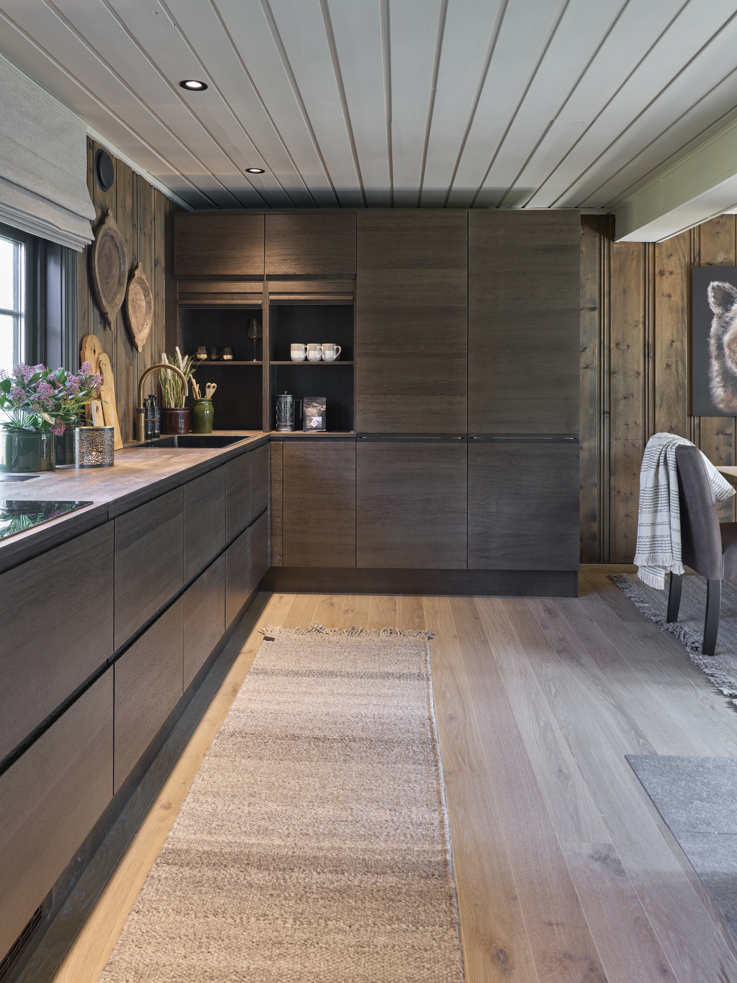 Här har Halvor Bakke och teamet valt ett kök som passar perfekt med omgivningarna: ett Nordic Inline-kök i rökt ek, med bänkskiva i massivträ och jalusiskåp i faner.