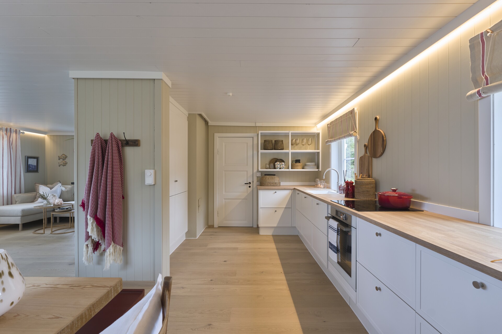 Därför har Halvor Bakke och teamet valt ett klassiskt, vitmålat Nordic Cubic till köket – en lösning som passar perfekt till stuglivet.