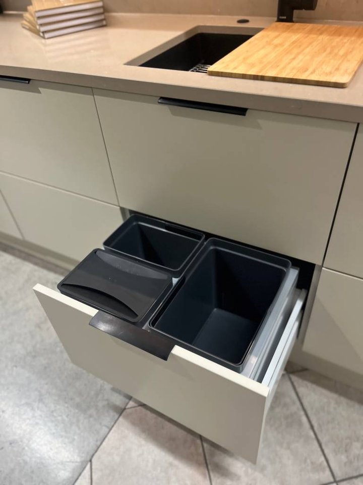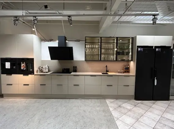 Nu säljer vi vårt utställningskök från JKE med luckan One i ljus sand.