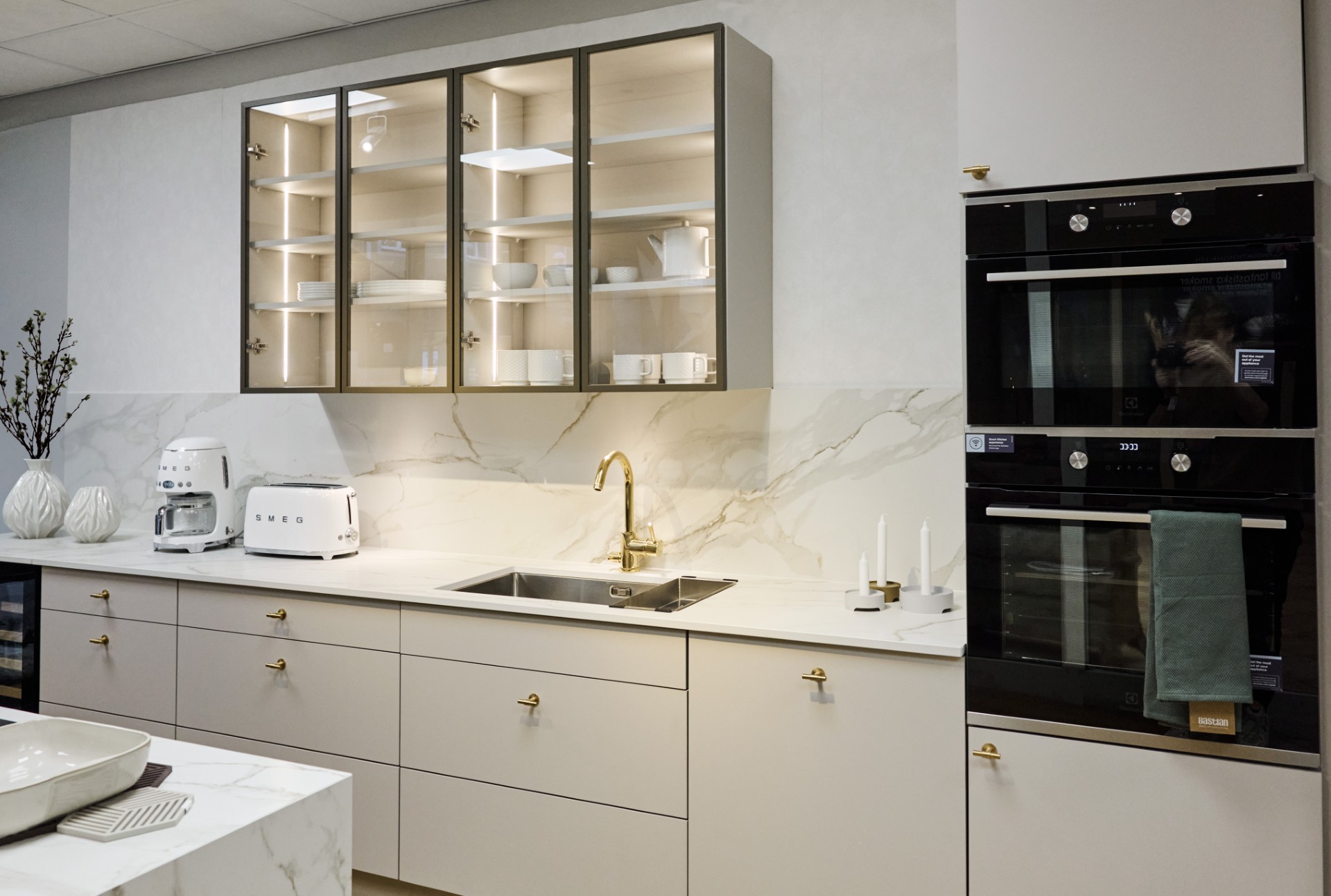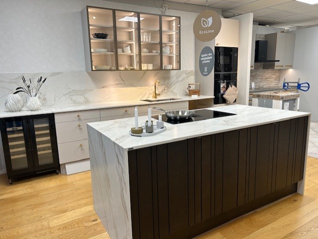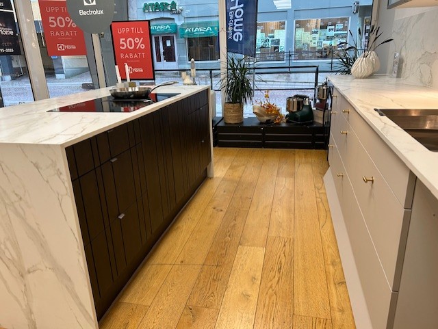 Nu säljer vi vårt utställningskök från JKE med luckan Silk greige och Woodland i rökt ek.